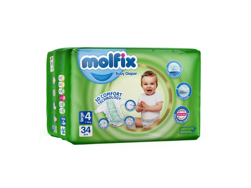 پوشک کودک سایز 4 بسته 34 عددی مولفیکس | فوق‌جاذب، ضدحساسیت، نرم و مناسب کودکان ۷ تا ۱۴ کیلوگرم